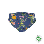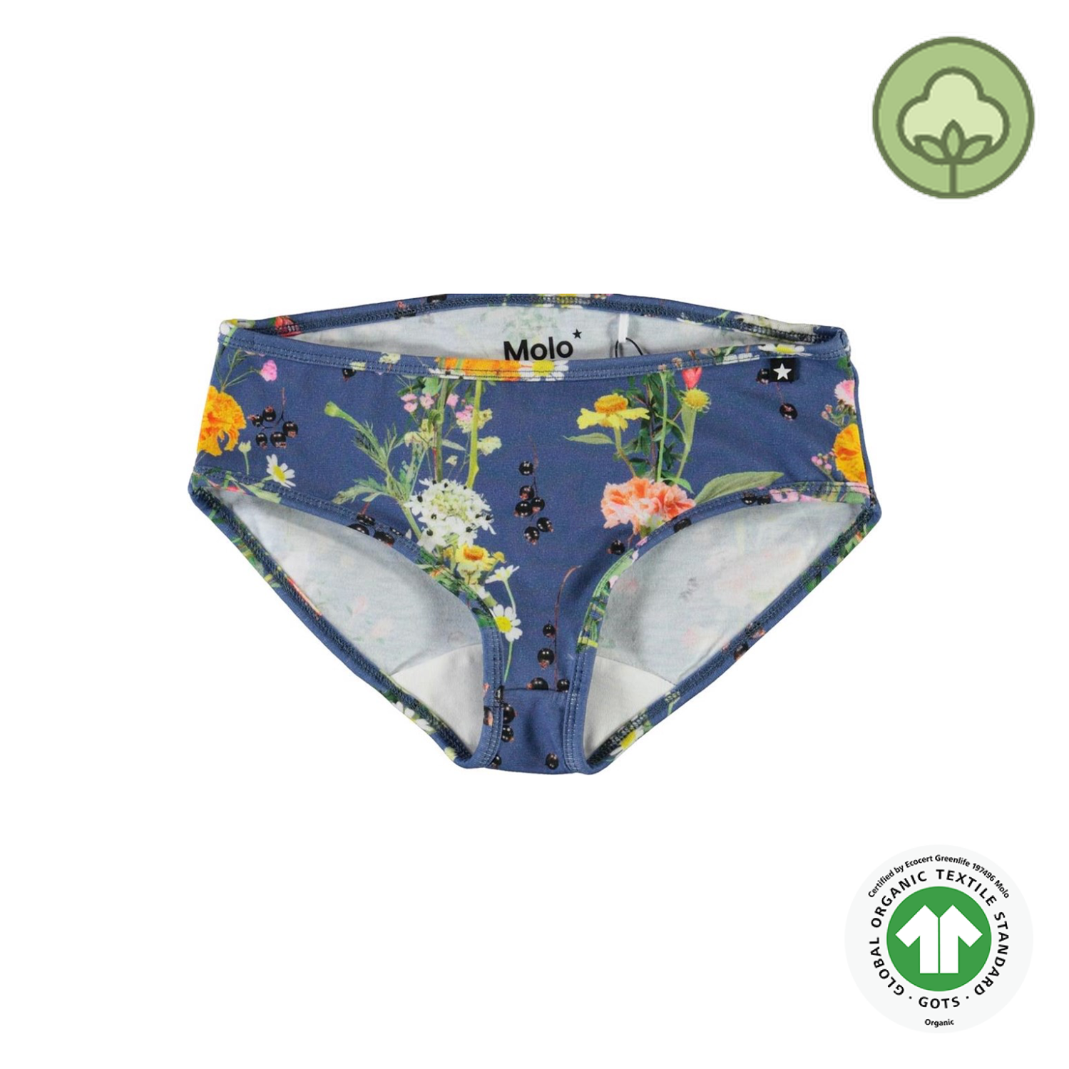 Blue knickers with a floral print. This Molo product is GOTS certified, which means it is made with certified organic materials and produced under the strictest social and environmental standards throughout the entire manufacturing process. In addition, the GOTS certification means that the product is free of hazardous chemicals. Certified by Ecocert Greenlife, certification number: 197496.