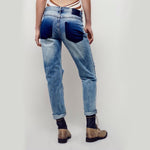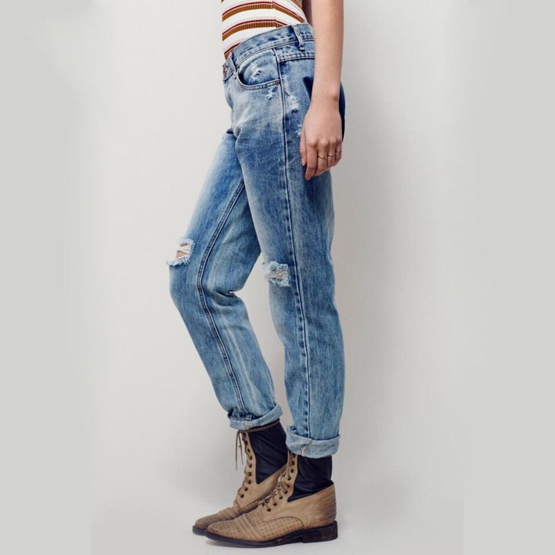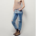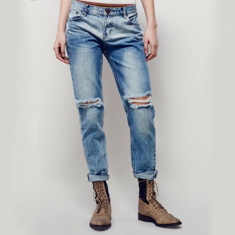 Distressed wash denim skinnies with a slightly baggy boyfriend fit. Shredded, destroyed holes on the front. 5-pocket style.