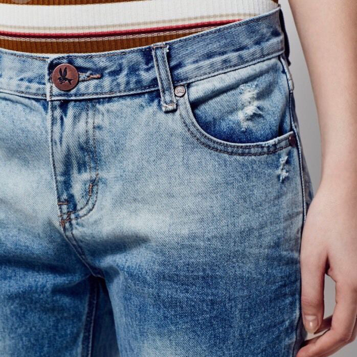 Zipper and button fly closure. 100% Cotton. Machine Wash Cold. Color: blue