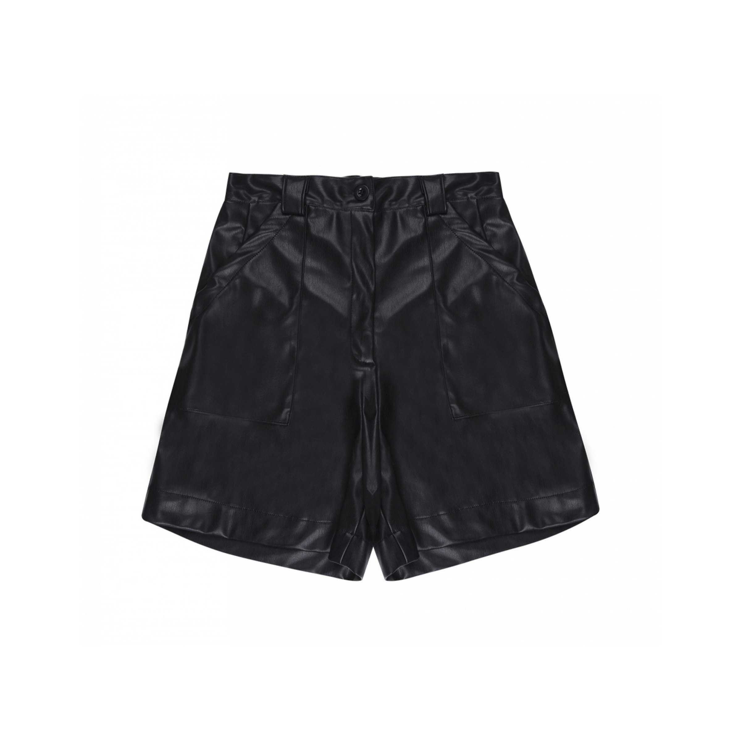 Woman's pocket shorts with elasticated waistband and button fastening. Made from recycled faux leather, produced without using solvents or harmful chemicals. Made with recycled plastics - reducing plastic waste and avoiding the production of petroleum-bas